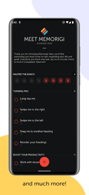 Memorigi todo list, task manager, planner, calendar, and reminders app provides an easy and intuitive user interface. You can use swipe gestures to quickly schedule and reorganize your to do lists, tasks, and projects. Memorigi's UI/UX is perfectly tailored to help you achieve the most from your day.